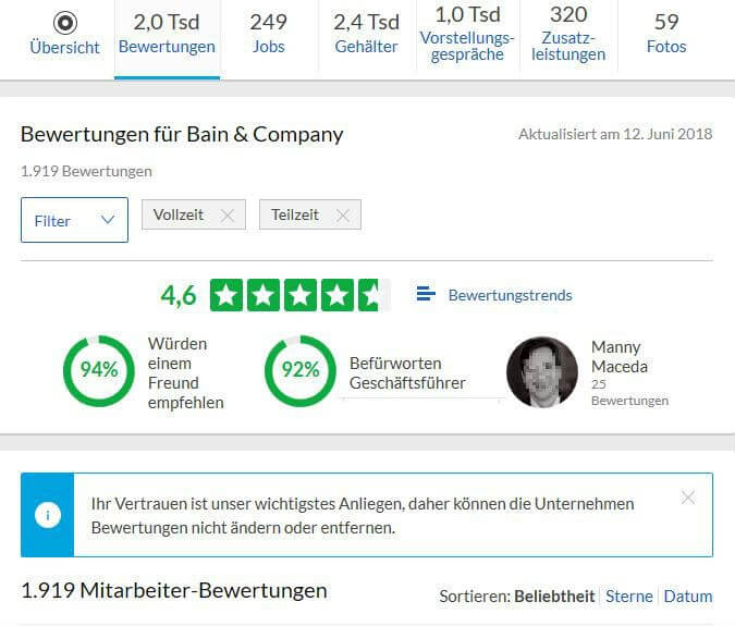 Das US-amerikanische Bewertungsportal Glassdoor wurde 2007 gegründet und verfügt seit Januar 2015 auch über eine deutschsprachige Version. Glassdoor fokussiert sich auf Informationen zum Arbeitgeber und bewertet die Höhe der Gehälter und die Qualität der Vorstellungsgespräche. Zusätzlich beinhalten die Bewertungen oftmals Fragen aus dem Vorstellungsgespräch, wodurch sich Bewerber optimal auf das persönliche Interview vorbereiten können.