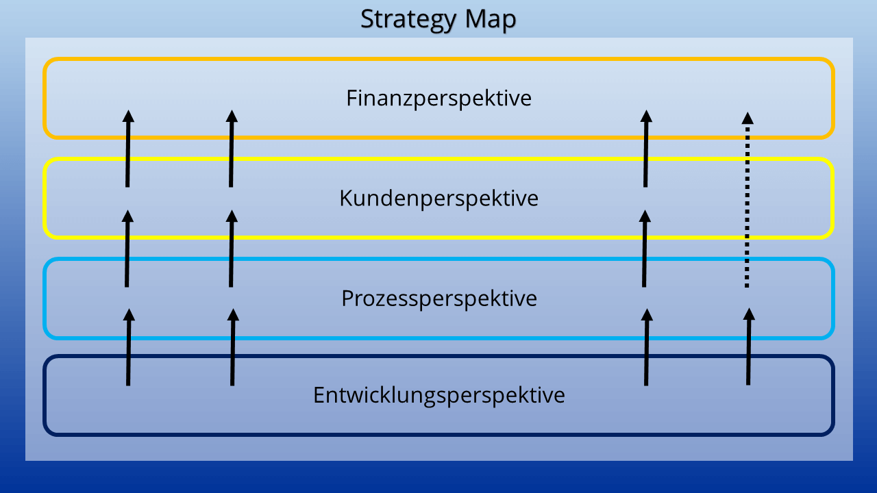 Die Balanced Scorecard beruht auf dem Prinzip von Ursache und Effekt. Die Entwicklungen in einem Bereich haben meist auch deutliche Auswirkungen auf Kennzahlen in anderen Bereichen. Dies Prinzip verdeutlicht beispielsweise eine Strategy Map. Sie veranschaulicht, wie das Erreichen von Zielen in einem Perspektivbereich die anderen Perspektiven beeinflusst. Daraus kann man eine Reihenfolge ableiten: Die Qualifikation der Mitarbeiter und der Entwicklungsgrad des Unternehmens (Entwicklungsperspektive) haben direkten Einfluss darauf, wie effizient man Produkte und Dienstleistungen bereitstellen kann (Prozessperspektive). Dies wiederum beeinflusst die Zufriedenheit der Kunden und den Preis (Kundenperspektive). Die Kunden wiederum kaufen die Produkte und sorgen damit für Umsatz und Rendite (Finanzperspektive).