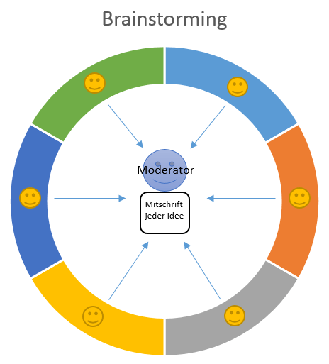 Als Brainstorming bezeichnet man eine Methode der Ideenfindung, bei der Gruppenteilnehmer ungeordnet und ungefiltert Ideen beitragen. Diese Ideen werden zunächst ohne Wertung und Zensur gesammelt und anschließend ausgewertet.