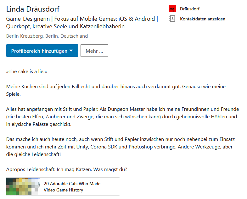 Das erste Beispiel zeichnet sich durch einen sehr sympathisch wirkenden Text aus. Er ist humorvoll formuliert und verrät mehr über den Charakter der Autorin als über ihre Fähigkeiten. Dennoch enthält er branchenrelevante Keywords sowohl in der Zusammenfassung als auch im Slogan. Das führt potenzielle Arbeitgeber, die die Suchfunktion nutzen, schnell auf dies Profil. Denn sucht einer von ihnen beispielsweise nach einem Game-Designer, der mit der Unity Engine umgehen kann und für Android programmiert, dürfte dies LinkedIn-Profil direkt in den Suchtreffern auftauchen.