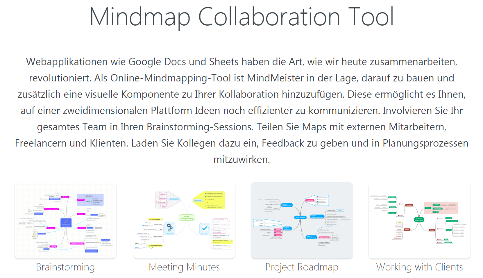 Die Anwendung mindmeister aus einem Münchner Entwicklerhaus empfiehlt sich selbst als „Mindmap Collaboration Tool“ mit besonderem Fokus auf Unternehmen wie Electronic Arts, CNN und Philips und will einen Funktionsumfang bieten, der dem selbstvergebenen Titel auch gerecht wird. Dazu gehören: Teilen von Mindmaps via Direktlink, Bulk-Einladung für Gruppen, Wiki-Maps oder Google Drive, Echtzeit-Kollaboration mittels Live-Chat, Änderungshistorie sowie Kommentar- und Abstimmfunktion für den Austausch von Feedback. Zudem ist mindmeister als mobile App für iOS und Android verfügbar.