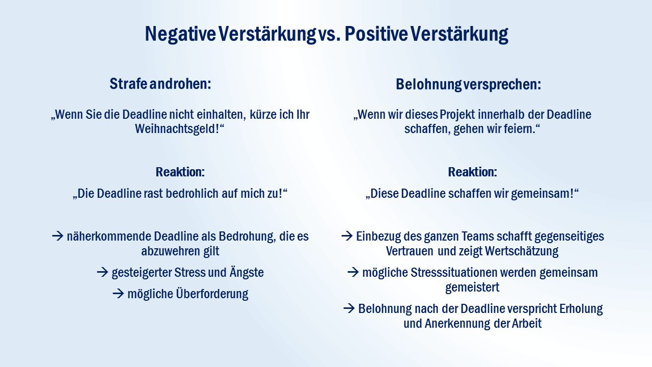 Extrinsische Motivation ist ein Faktor, den Vorgesetzte beeinflussen können. Negative Verstärkung jedoch sollte man nur bei Fehlverhalten anwenden. Es wäre nicht zielführend, Mitarbeitern vorsorglich mit Urlaubskürzung zu drohen, wenn Sie ein wichtiges Projekt nicht innerhalb einer Deadline schaffen. Stattdessen ist eine angebrachte Belohnung wie ein gemeinsamer Ausflug oder ein Tag mehr Urlaub ein besserer Anreiz. Denn schließlich muss die intrinsische Motivation erhalten bleiben, und das gelingt eben durch positive Gefühle gegenüber der Tätigkeit. Die drohende Bestrafung fördert eher Ängste und kann zu Abwehrhaltung führen.