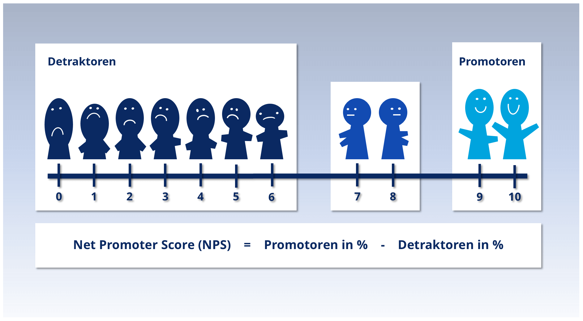 NPS = Prozentsatz aller Promotoren - Prozentsatz aller Detraktoren