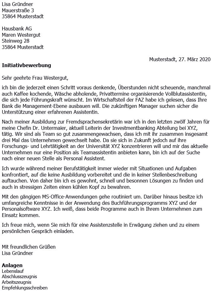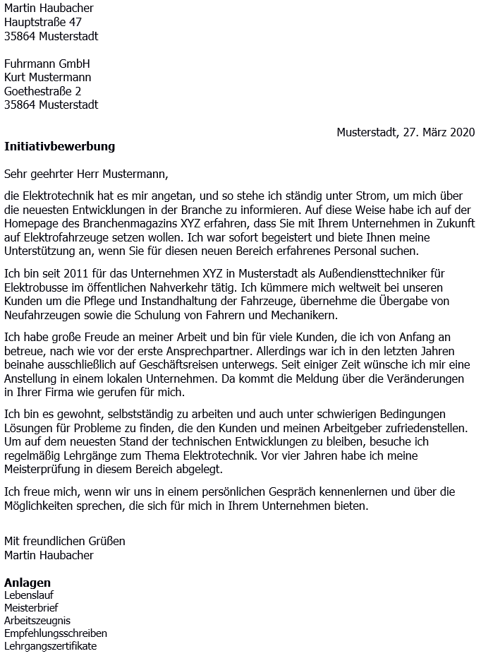 Allerdings ist es besonders bei einer Initiativbewerbung wichtig, das Anschreiben so individuell wie möglich zu verfassen. Ihre persönliche Motivation, sich ausgerechnet bei diesem Unternehmen zu bewerben, muss zum Ausdruck kommen. Aus diesem Grund sollten Sie Musterbeispiele niemals kopieren, sondern lediglich zur Inspiration für Ihre eigene Bewerbung nutzen.