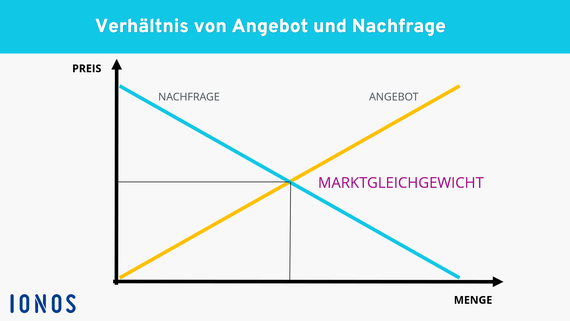 An dem Punkt, an dem sich Angebotskurve und Nachfragekurve treffen, ist das Verhältnis von Angebot und Nachfrage vollkommen ausgeglichen. Es wird exakt so viel produziert, wie gebraucht wird, und sowohl Marktpreis als auch Produktionsmenge bleiben stabil. Es herrscht das sogenannte Marktgleichgewicht, das allerdings nur eine theoretische Größe ist. In der Realität wechseln sich Nachfrage- und Angebotsüberhang immer wieder ab. Dieses Phänomen wird häufig mit dem Satz „Der Markt reguliert sich selbst.“ beschrieben.