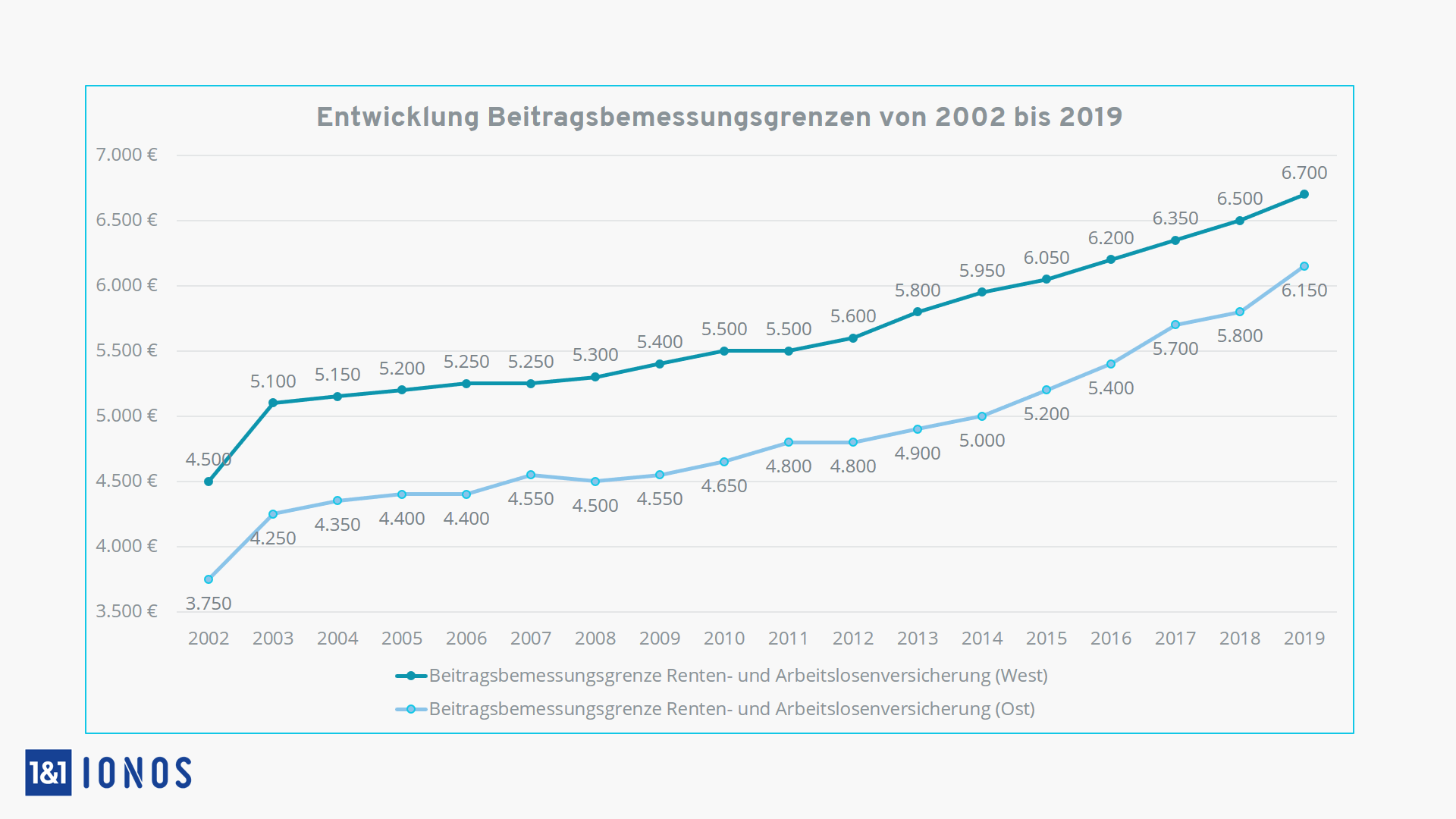 Wie die Entwicklungskurve der Beitragsbemessungsgrenze für Rentenversicherung und Arbeitslosenversicherung in Ost und West ab 2002 aussieht, zeigt folgendes Diagramm: