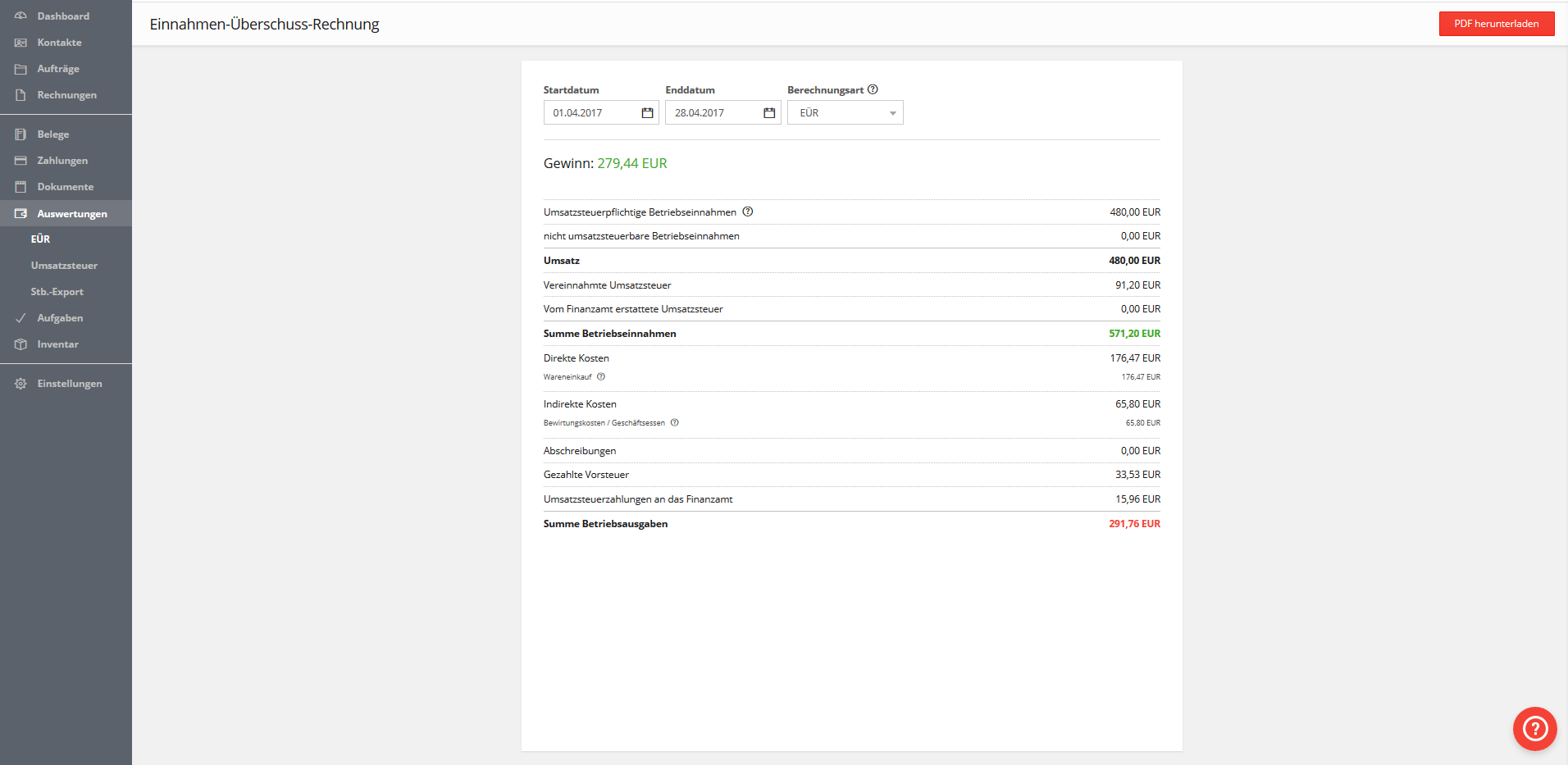 Mittels der EÜR sehen Sie, wie wirtschaftlich Ihr Unternehmen zu einer gewissen Zeitspanne war: Definieren Sie einfach einen Zeitraum und schon zeigt Ihnen die Anwendung Ihre Bilanz. Alle relevanten und im System verbuchten Einkünfte und Ausgaben werden bei der EÜR berücksichtigt. Und die EÜR lässt sich selbstverständlich auch als PDF exportieren.