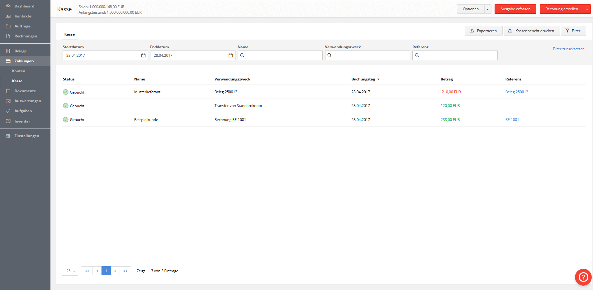 Mit einem Kassenbuch lässt sich der komplette Zahlungseingang und -ausgang festhalten. Die Kosten und Einkünfte listet die Software automatisch anhand der erfassten Belege, Portoausgaben und vorgenommenen Überweisungen auf (wenn Sie Ihr Online-Banking-Konto mit der Anwendung verbinden, können Sie Geldsendungen direkt über das Tool abwickeln). Tages- und Monatsabschlüsse generieren Sie über solch ein Kassenbuch im Handumdrehen.