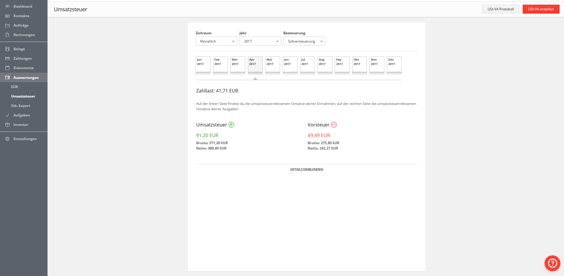 Die Voranmeldung für die Umsatzsteuer müssen umsatzsteuerpflichtige Unternehmen in Deutschland vierteljährlich oder monatlich leisten. Das erfolgt in aller Regel über die elektronische Steuererklärung ELSTER. Die Buchhaltungs-Software erstellt viele Bestandteile der Umsatzsteuer-Voranmeldung bereits anhand der eingegangenen und ausgegangenen Rechnungen. Das Programm trennt hierbei auch zwischen den unterschiedlichen Umsatzsteuersätzen.