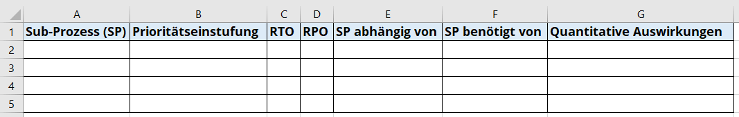- Spalte E: Recovery Time Objective – Benötigte Zeit zur Wiederherstellung des PP nach Störungsfall