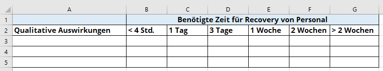 - Spalten B–G: Benötigte Zeit für Recovery von Personal – Zeigt an, wie viel Zeit benötigt wird, bis Mitarbeiter zum „Business almost as usual“ übergehen können