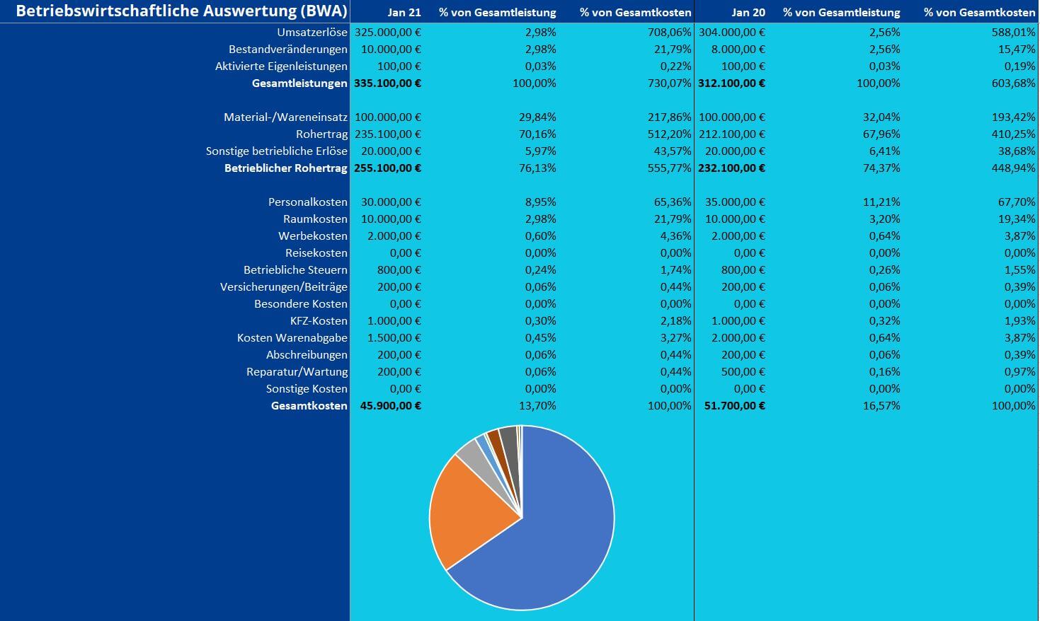 Das allein gibt schon einen guten Überblick über die wirtschaftliche Lage Ihres Unternehmens. Damit Sie aber weitere Informationen aus den enthaltenen Zahlen ableiten können, lohnen sich zusätzliche Angaben: Zum einen ist es interessant, wie sich die Werte entwickeln. Haben Kosten und Umsätze im Vergleich zum Vormonat zu- oder abgenommen? Fügen Sie daher Werte aus vergangenen Monaten oder Jahren in die BWA ein. Zusätzlich geben Quoten Auskunft darüber, wie sich Gewinne oder Kosten zusammensetzen, z. B. welchen Anteil der Gesamtleistung Sie für Personalkosten aufwenden mussten. Wenn Sie Vorjahreswerte und Quoten zusätzlich durch Diagramme visualisieren, erfahren Sie die wichtigsten Informationen bereits mit nur einem Blick.