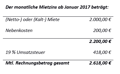 - Mietzins und Umsatzsteuer: Die zu zahlende Umsatzsteuer sowie der jeweilige Steuersatz werden zusätzlich zum monatlichen Mietzins und etwaigen Nebenkosten gesondert ausgewiesen. Führen Sie zudem den zu zahlenden Gesamtbetrag auf.
