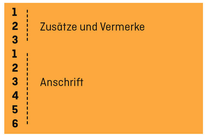 Das Anschriftenfeld hat eine Größe von neun Zeilen und bietet Platz für postalische Zusätze, besondere Vermerke (in den ersten drei Zeilen) sowie für die komplette Anschrift inklusive Firmenname, Abteilung und Ansprechpartner. Wenn Ihr Schriftwechsel keinen Zusatz benötigt, lassen Sie die ersten drei Zeilen des Briefkopfes frei.