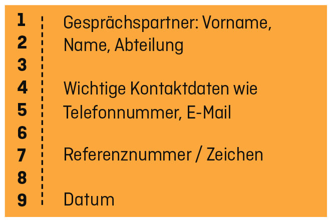 Empfehlenswert und für den Empfänger hilfreich ist es auch, folgende Informationen bei jeder Geschäftskorrespondenz anzugeben: