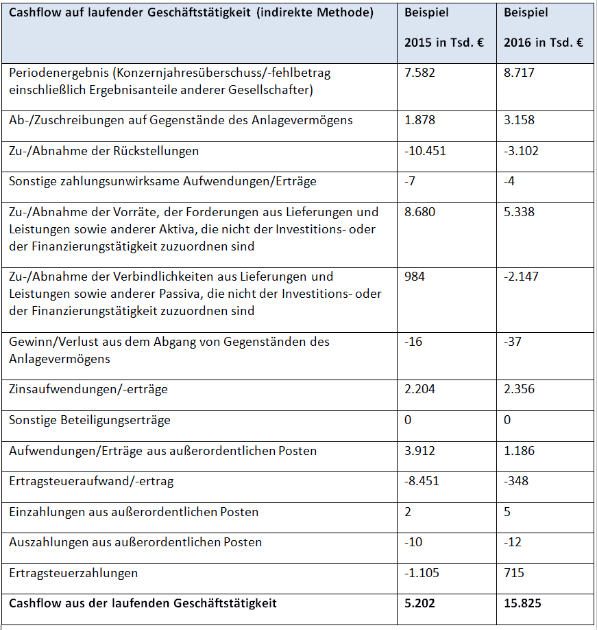 - Berechnet ein Unternehmen den operativen Cashflow nach der indirekten Methode und geht dabei nicht vom Periodenergebnis aus, muss der Anhang eine rechnerische Überleitung auf das Periodenergebnis beinhalten.