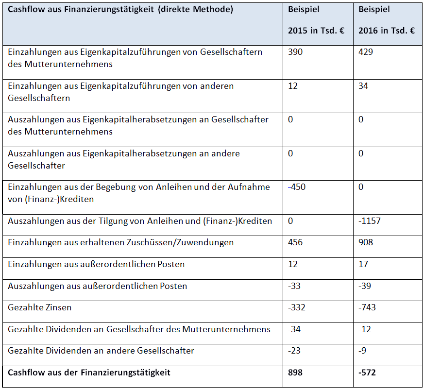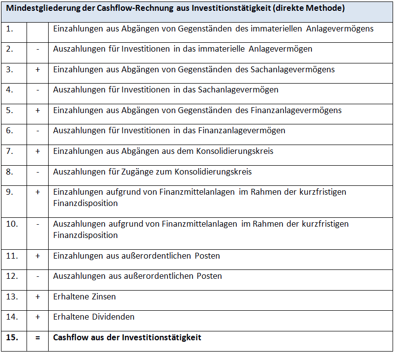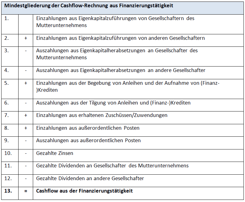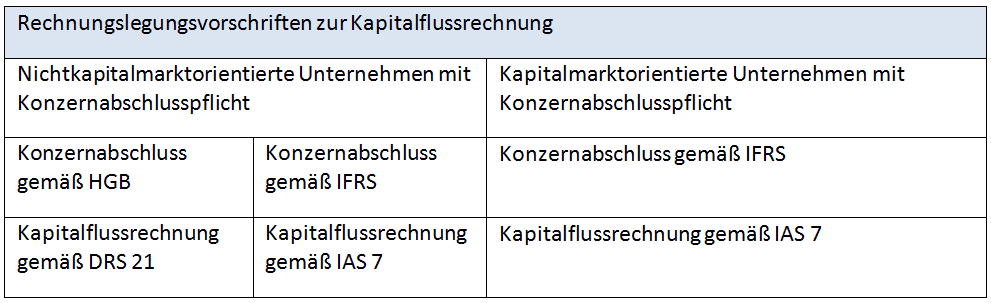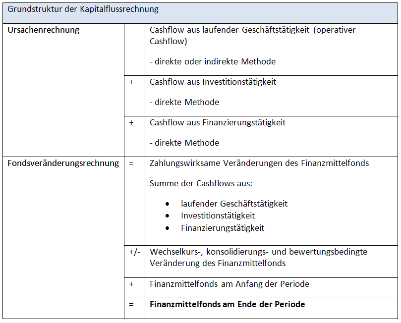Folgende Tabelle zeigt die Grundstruktur der Kapitalflussrechnung im Überblick. Die Angaben berücksichtigen sowohl den nationalen (DRS 21) als auch den internationalen Standard (IAS 7) und können als kleinster gemeinsamer Nenner verstanden werden.