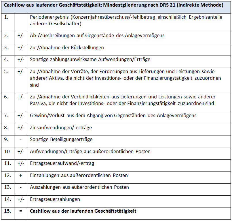 Eine Berechnung des Cashflows der laufenden Geschäftstätigkeit auf Basis der indirekten Methode muss sich gemäß DRS 21 an folgender Mindestgliederung orientieren.