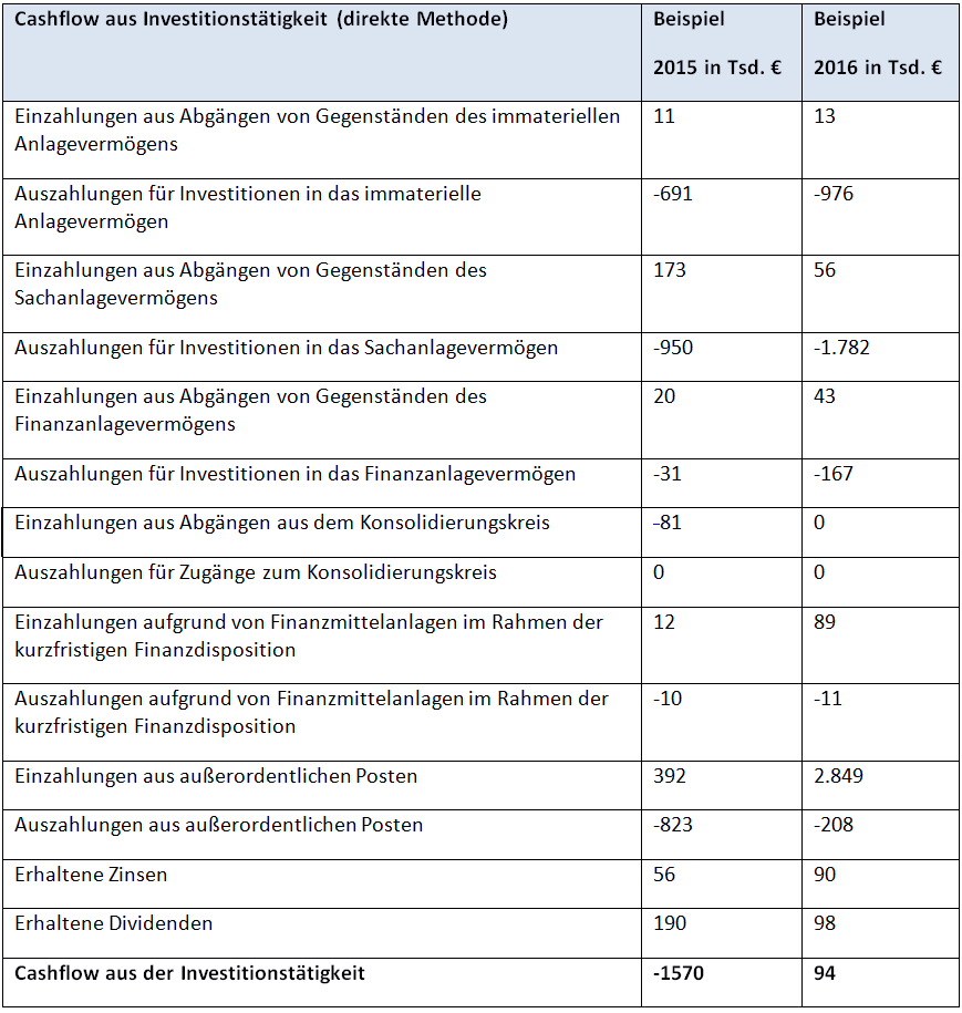 Sowohl der DRS 21 als auch der IAS 7 schreiben für die Darstellung des investiven Cashflows die direkte Berechnungsmethode vor. In dieser Form gibt er internen und externen Adressaten eines Konzern- oder Jahresabschlusses die Möglichkeit, abzuschätzen, in welchem Ausmaß ein Unternehmen seine Ressourcen investiert, um zukünftig Erträge generieren zu können.