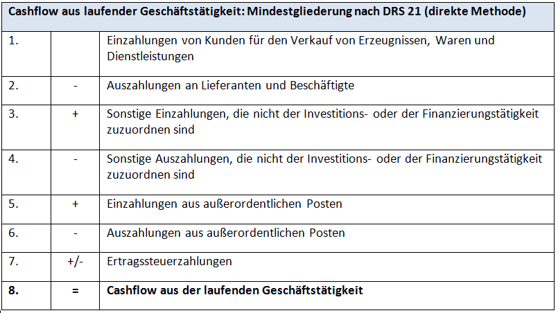 Während der IAS 7 lediglich die Grundstruktur der Kapitalflussrechnung vorschreibt und sich bei der tiefer gegliederten Darstellung auf Beispiele beschränkt, gibt der DRS 21 Unternehmen ein verpflichtendes Mindestgliederungsschema an die Hand. Die folgende Darstellung der Cashflow-Rechnung folgt dem nationalen Standard. Dieser orientiert sich weitgehend an internationalen Regelungen. Das Mindestgliederungsschema gemäß DRS 21 steht daher prinzipiell nicht im Wiederspruch zum Standard IAS 7, der bezüglich der Gliederung einzelner Positionen der Aufstellung keine detaillierten Vorgaben macht. Wichtige Unterschiede bei der Berechnung des Cashflows nach DRS 21 und IAS 7 werden am Ende dieses Artikels thematisiert.