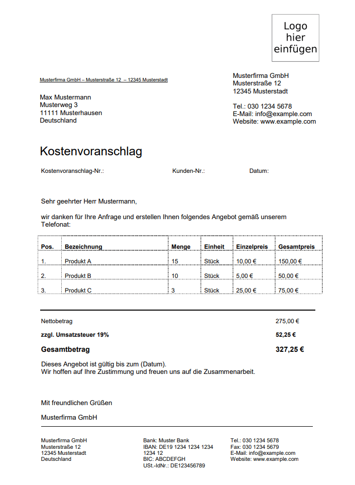 Sie können diese sowie eine Version für Microsoft Excel kostenlos bei uns herunterladen (siehe Download-Bereich). Während vielen Nutzern die Handhabung von Word leichter fällt, haben Sie bei Excel einige praktische Tabellenkalkulationsfunktionen zur Verfügung, etwa Formeln für die automatische Berechnung des Gesamtpreises Ihres Kostenvoranschlags.