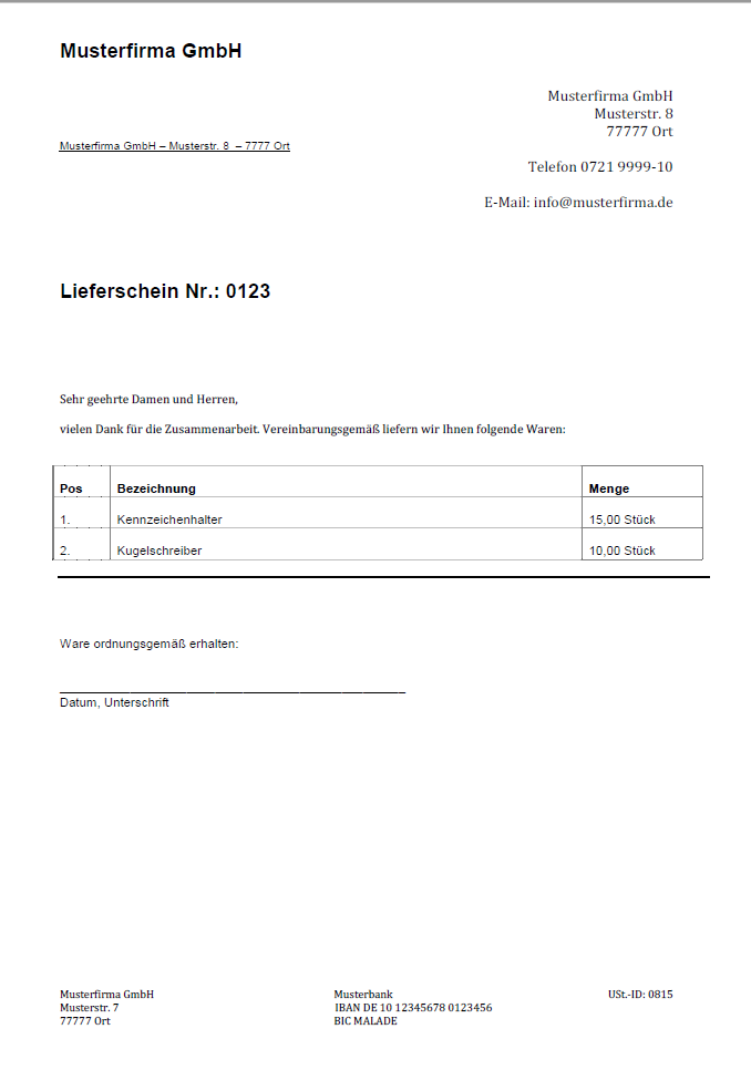 Damit eine Vorlage für die Erstellung von Lieferscheinen geeignet ist, sollten folgende Angaben unbedingt berücksichtigt sein: