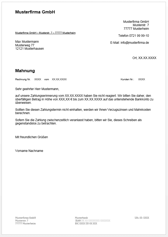 i. Fußtext: Der Fußbereich des Mahnschreibens beinhaltet die komplette Anschrift Ihres Unternehmens, Ihre Umsatzsteuer-Identifikationsnummer (UST-ID) sowie die Bankverbindung auf die die Zahlung erfolgen soll: Name der Bank, IBAN/Kontonummer und BIC/Bankleitzahl. Achten Sie auch hier darauf, dass Sie die Platzhalter der Vorlage komplett mit Ihren individuellen Angaben überschreiben.