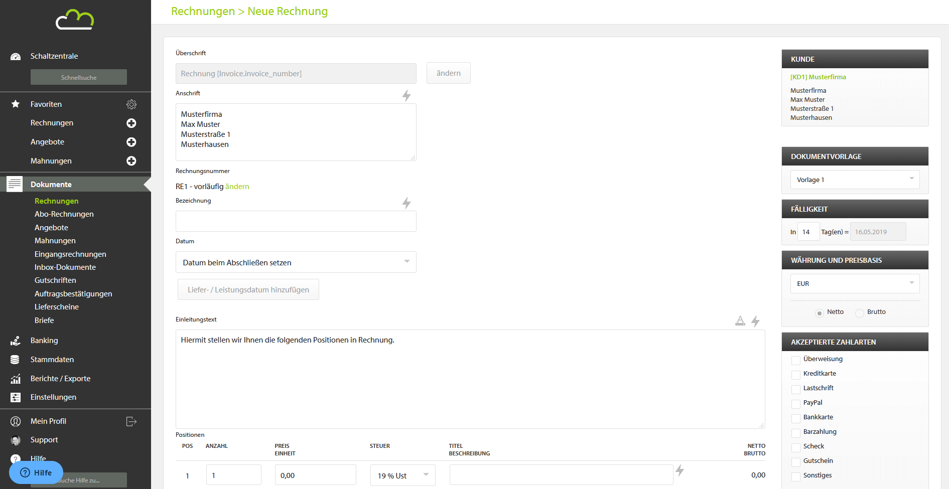 Auch das Erstellen der Rechnung verläuft ganz ähnlich zu den Angeboten anderer Hersteller: Sie füllen eine einfache Maske aus und profitieren von Automatisierungsprozessen. Was Sie einmal angelegt haben, können Sie auch in neue Rechnungen wieder übernehmen. Sehr prominent fällt der Brutto-Netto-Schalter auf: Mit nur einem Klick wechseln Sie zwischen der Rechnungserstellung für Geschäfts- und Privatkunden. Auch bei Lexware können Sie ein PayPal-Konto hinterlegen, um Zahlungen zu vereinfachen.