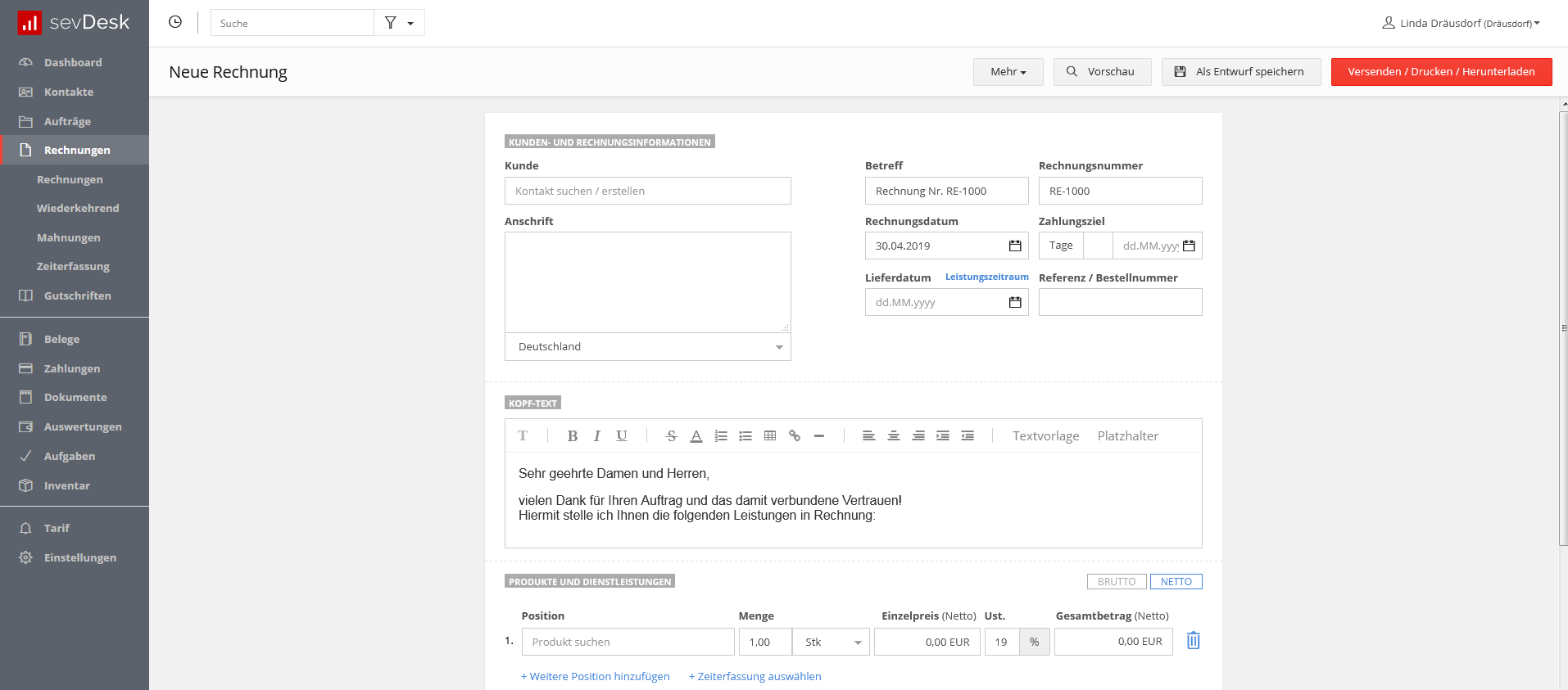 Auch sevDesk stellt Unternehmen ein Online-Rechnungsprogramm zur Verfügung. Über die Website meldet man sich an und befindet sich dann im persönlichen Dashboard. Neben anderen Funktionen lassen sich hier auch mit wenigen Schritten Rechnungen erstellen. Dafür hat die Anwendung eine Maske vorgesehen, in der Sie die einzelnen Posten aufführen können. In den Kopf- und Fußfeldern können Sie Ihren eigenen Text verfassen. Damit Sie nicht den gleichen Text jedes Mal aufs Neue verfassen müssen, lassen sich unterschiedliche Textvorlagen speichern. Um die Rechnung noch individueller zu gestalten, kann man eigenes Briefpapier hinterlegen.