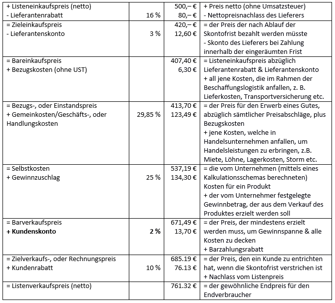 Beispiel: Ein Unternehmen beginnt seine Kalkulation ausgehend von einem Listeneinkaufspreis, den er für die neue Ware bezahlen müsste. Der Listeneinkaufspreis beträgt 500,– € netto. Der Lieferrabatt beträgt 16 % und der Lieferskonto 3 %. Die Bezugskosten belaufen sich auf 6,30 € (netto). Die Berechnung des Handlungskostenzuschlages ergibt 29,85 %. Es wird ein Gewinn von 25 % einkalkuliert. Der Kunde kann 2 % Skonto abziehen und 10 % Rabatt.