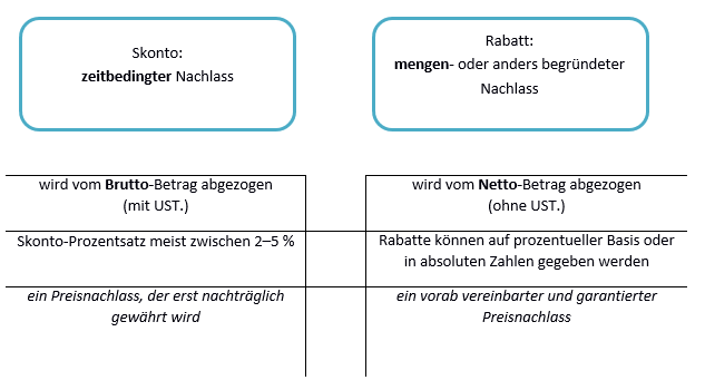 Ein Rabatt ist ein garantierter Nachlass vom Listenverkaufspreis und Skonto ein optionaler Nachlass vom Rechnungsendbetrag.