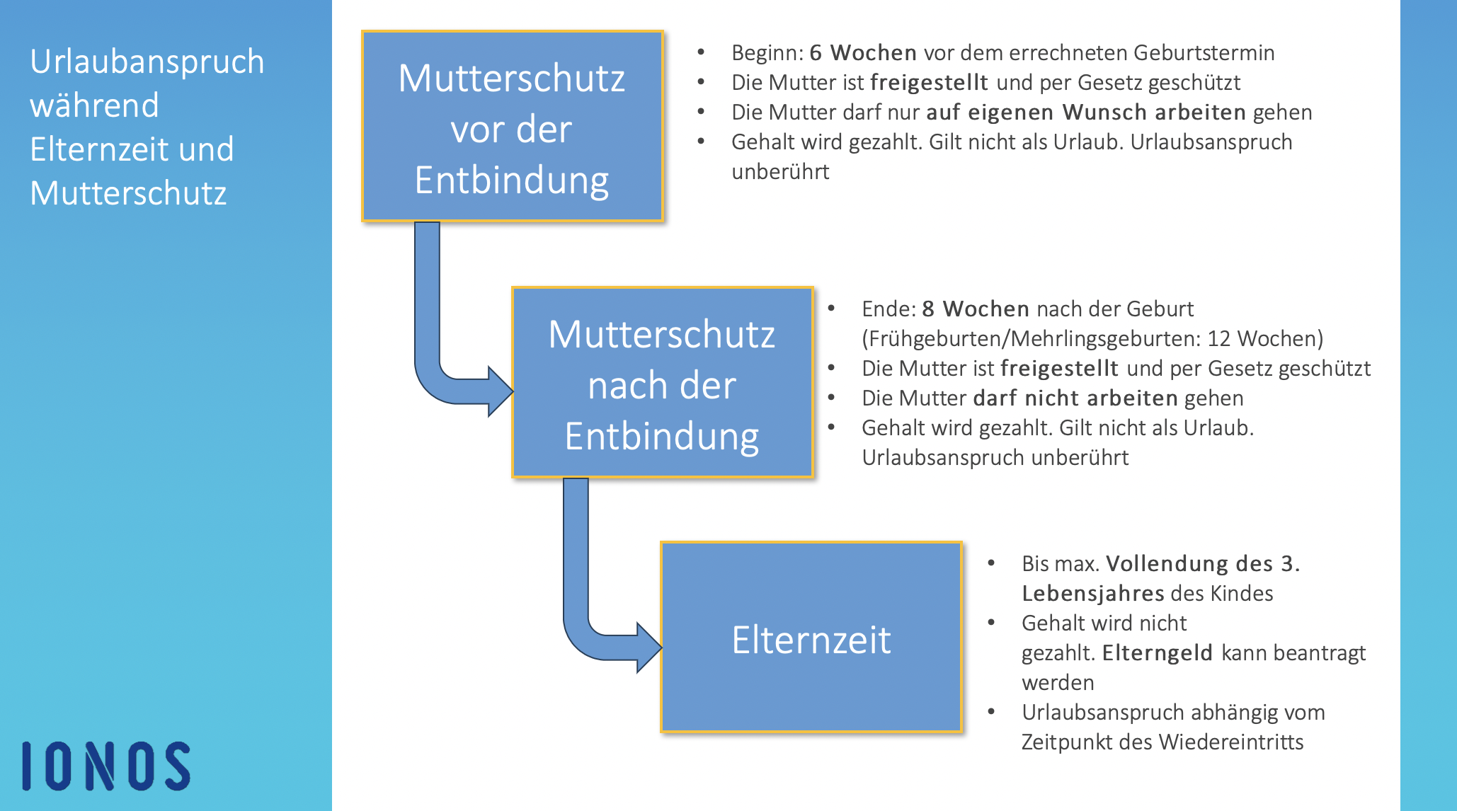 Für die Wochen vor und nach der Entbindung müssen Mütter prinzipiell keinen Urlaub nehmen, wenn Sie Mutterschutz in Anspruch nehmen. Das Mutterschutzgesetz (MuSchG) lässt den Urlaubsanspruch der Mutter vor und nach der Geburt unberührt. Der Urlaubsanspruch in der Elternzeit ist nicht geschützt; Arbeitgebende können ihn also am Ende dieser Zeit anteilmäßig kürzen.