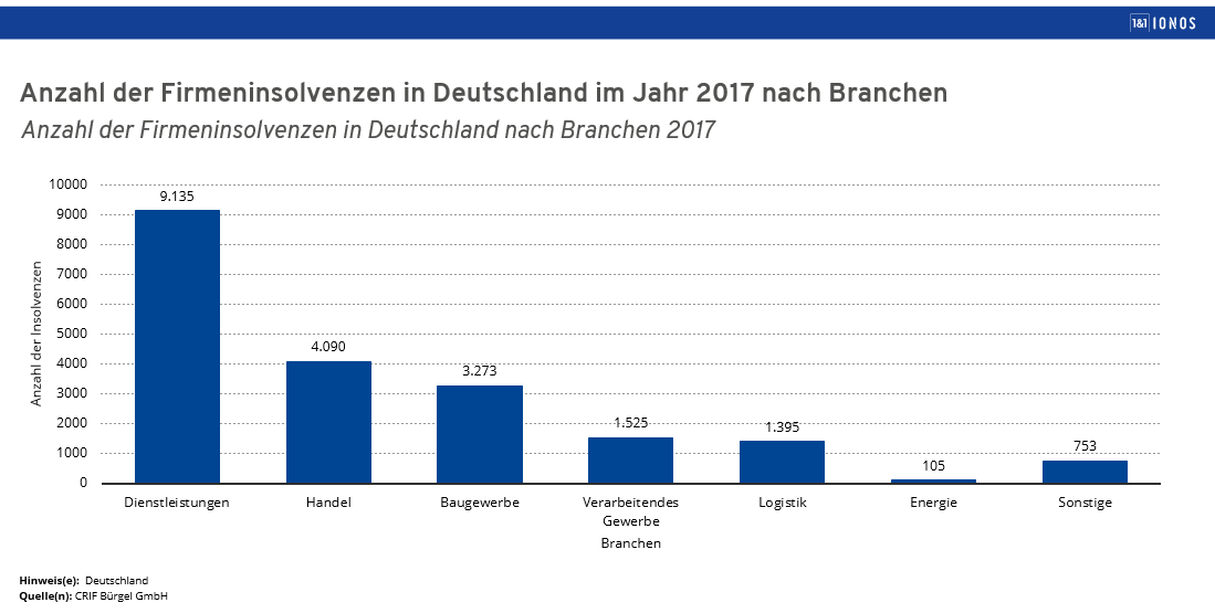 Schaut man jedoch auf eine nach Branchen geordnete Übersicht der Unternehmensinsolvenzen im Jahr 2017 von Statista, nehmen diese beiden Branchen „nur“ die Plätze 3 und 4 ein. Dagegen entfällt weit mehr als die Hälfte aller Insolvenzen in Deutschland auf Dienstleistungsunternehmen und den Handel. Das hat vor allem damit zu tun, dass ein Großteil der Unternehmensgründungen in diesen Branchen stattfindet, was den Konkurrenzdruck erhöht. Darüber hinaus sind neu gegründete Unternehmen aufgrund der fehlenden Erfahrungen der Unternehmer besonders anfällig für Fehlplanungen.