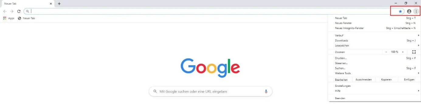 Schritt 1: Starten Sie Chrome und öffnen Sie das Hauptmenü über das Drei-Punkte-Icon, das sich oben rechts neben der Adresszeile befindet: