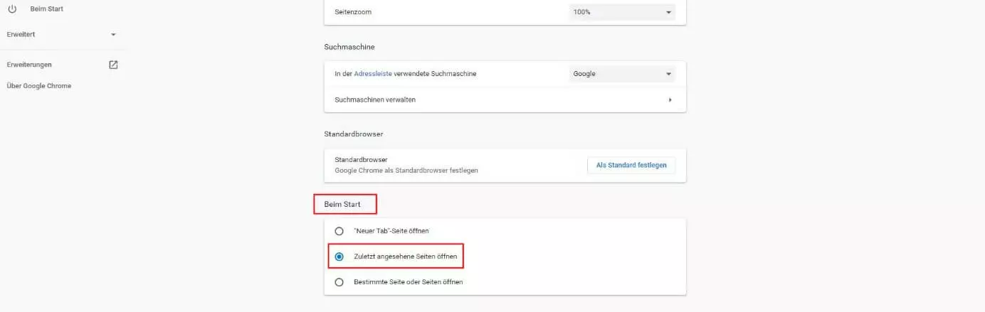 Wiederherstellung der letzten Chrome-Sitzung zur Standardeinstellung machen