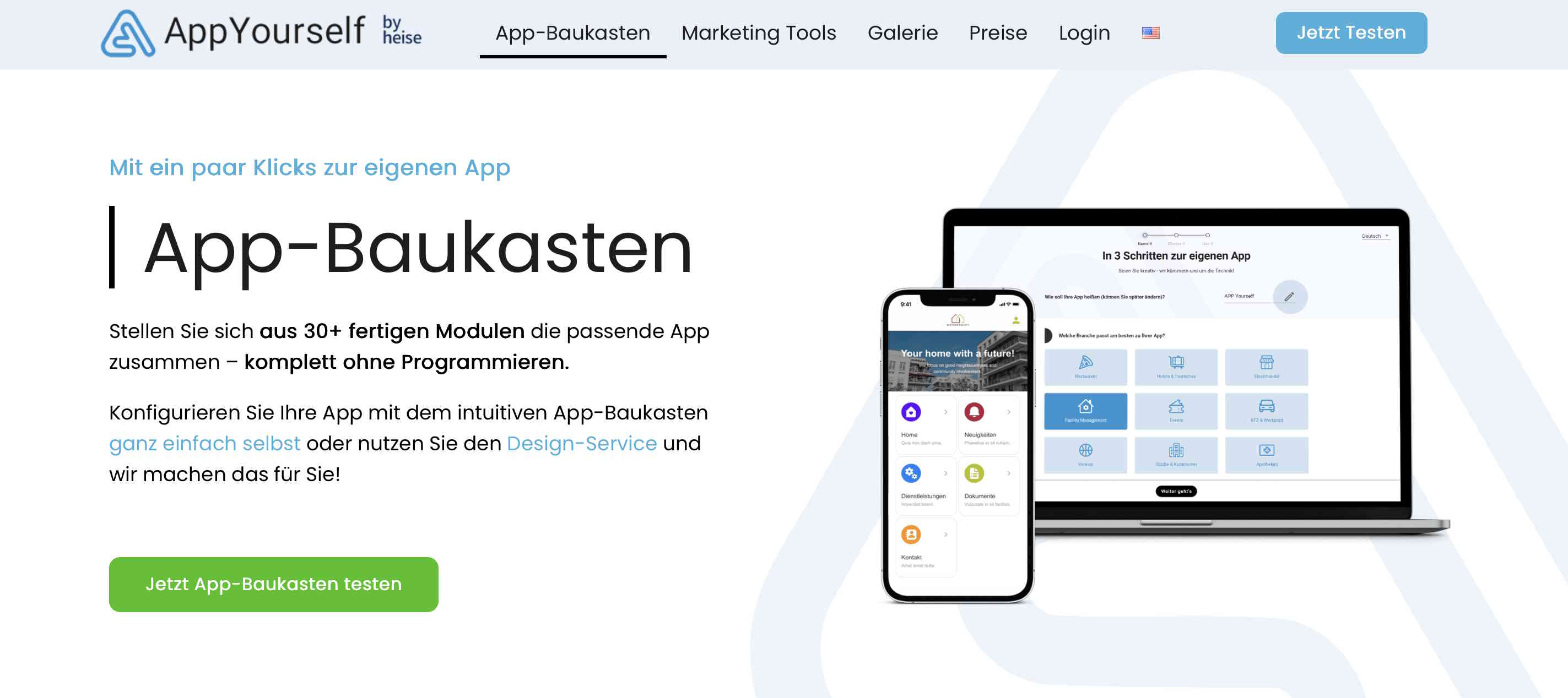 Mit AppYourself hat es auch der App-Creator eines deutschen Unternehmens in unsere Liste geschafft. Dieser besticht vor allem damit, dass bei der Erstellung einer App je nach Plan ein Design-Service in Anspruch genommen werden kann. Diesem teilen Sie mit, was Sie sich für Ihre App vorstellen – Sie erhalten dann eine fertige Baukasten-App ohne eigenen Aufwand.