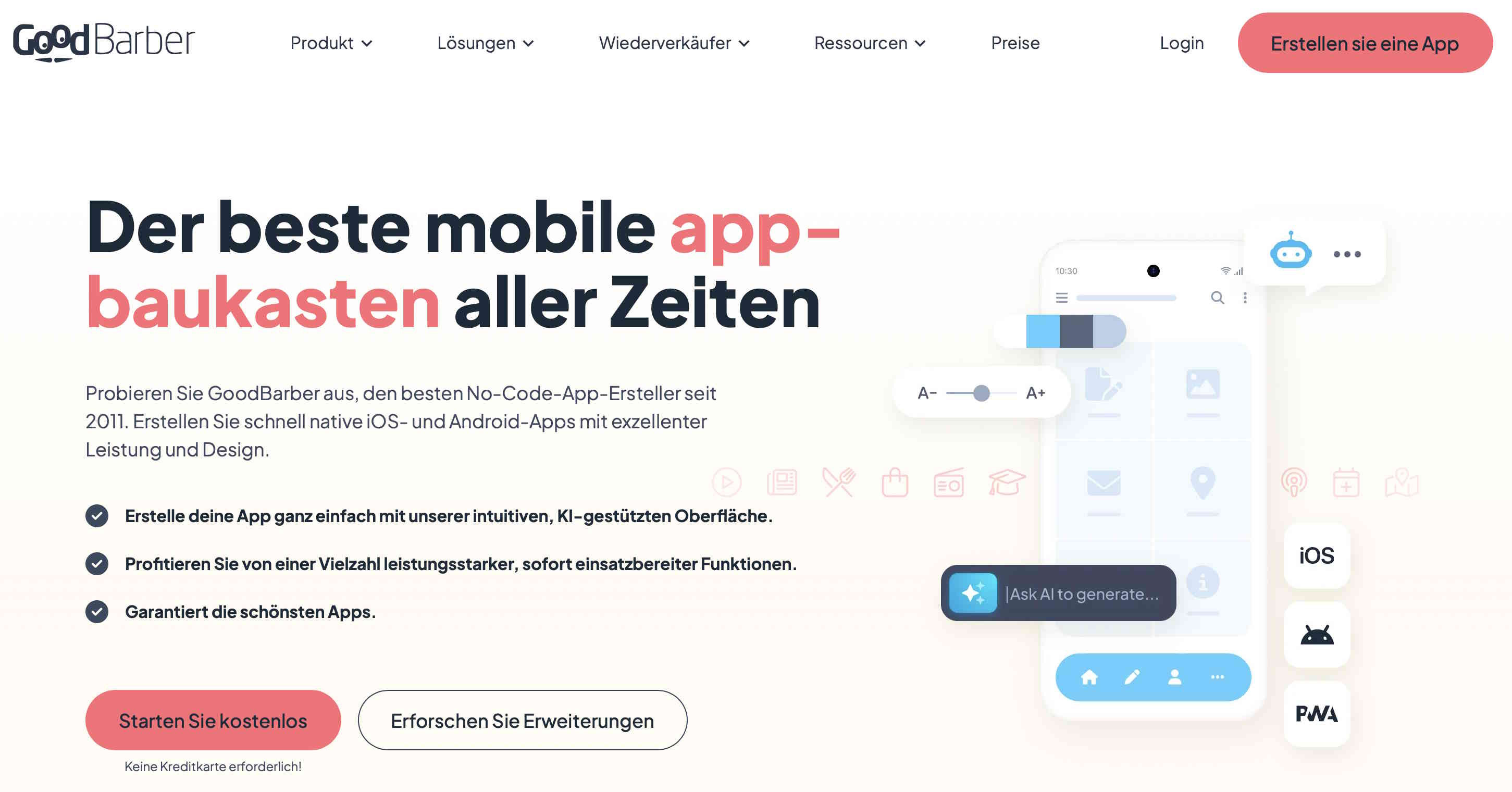 Dieser Native-App-Baukasten für iOS- und Android-Anwendungen überzeugt mit vielfältigen Design-Möglichkeiten. Sie haben die Auswahl zwischen einer Menge professionell und geschmackvoll aussehenden Gestaltungsvorlagen, die sich außerdem gut individualisieren lassen. GoodBarber punktet weiterhin durch sehr viele Add-ons, die den Funktionsumfang beispielsweise um Geofencing, iBeacons oder auch Community-Management erweitern. Dank KI-Integration lassen sich Inhalte noch schneller und SEO-optimiert erstellen.