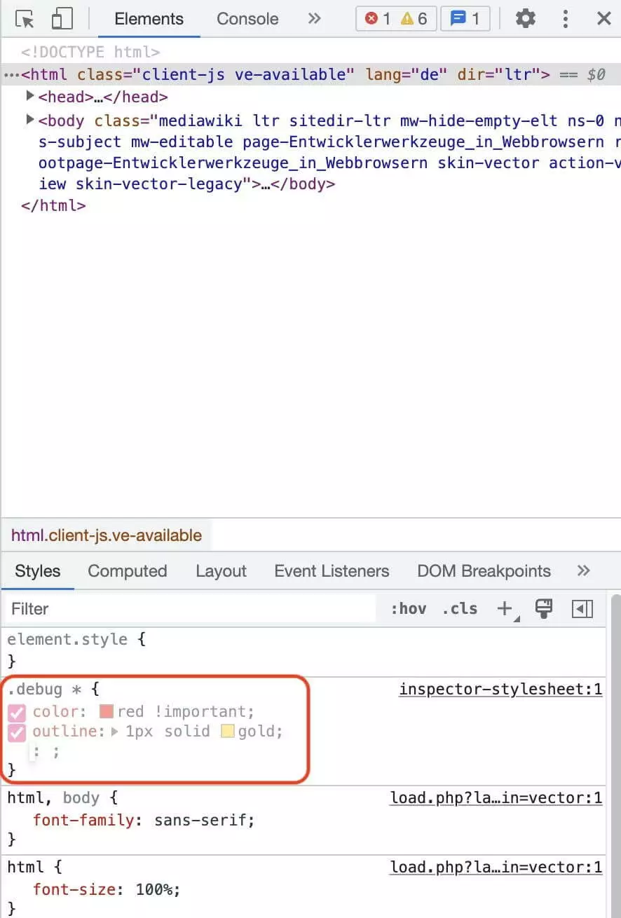 Die Chrome Developer Tools finden in der Webentwicklung zum Prototypisieren und Testen, sowie bei der Fehlersuche Verwendung. Ein häufiger Nutzen besteht darin, eine neue CSS-Style-Regel zu definieren und auf Elemente anzuwenden. Wir zeigen dies am Beispiel einer Debug-Klasse. Weisen wir einem Element die Klasse zu, werden alle Kind-Elemente in roter Schrift dargestellt. Ferner werden die Elemente mit einem goldenen Rand versehen. So lassen sich Layout-Fehler diagnostizieren. Hier der zum Einsatz kommende CSS-Code: