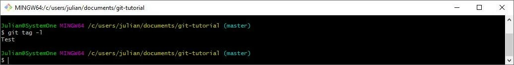 git tag TestSobald Tags für Ihr Repository existieren, können Sie sich diese mit dem bereits bekannten „git tag“ und den optionalen Parametern „-l“ bzw. „--list“ anzeigen lassen: