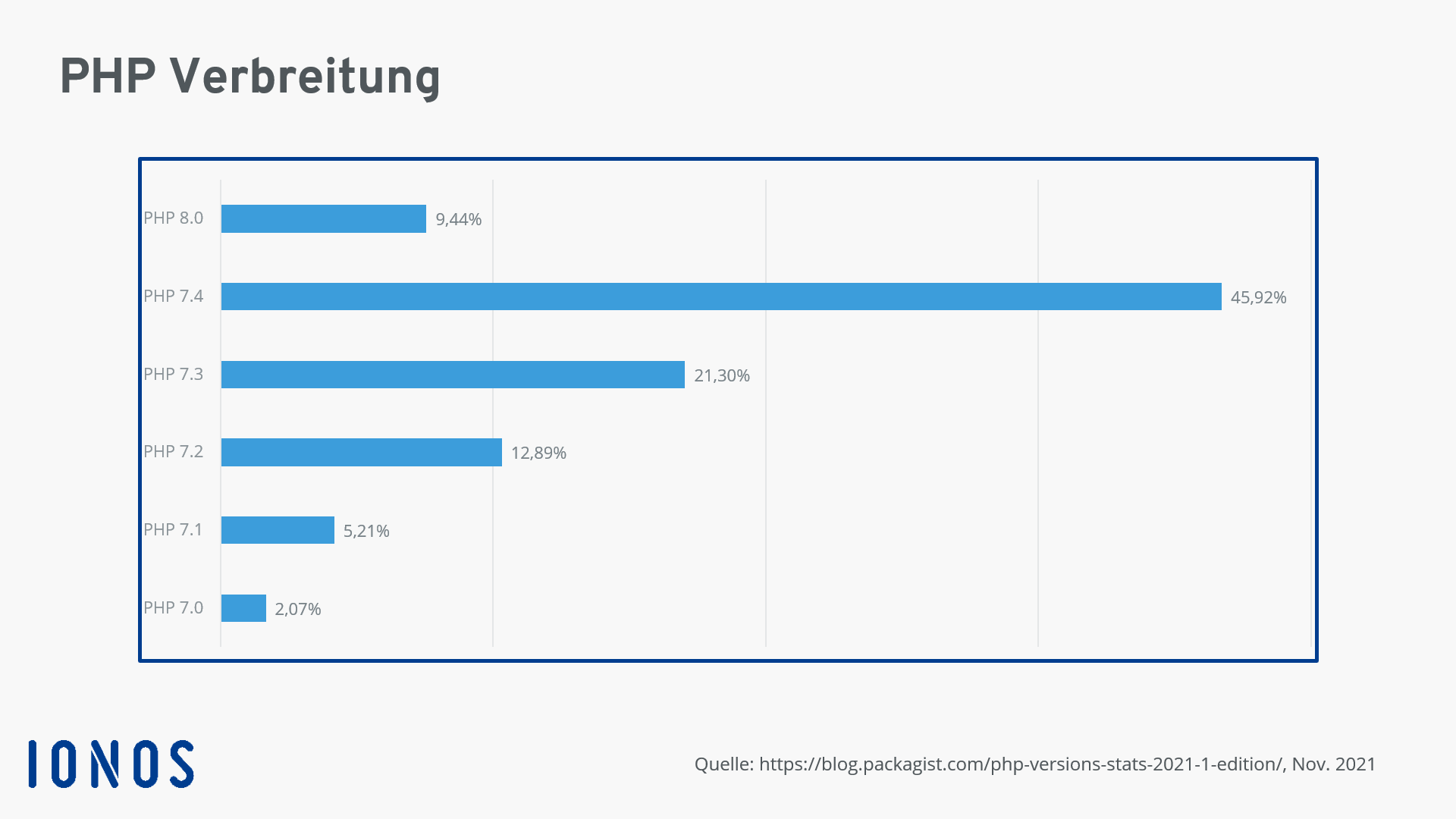 Die darauffolgenden Versionen PHP 7.1 und PHP 7.2 brachten größtenteils Detailverbesserungen. PHP 7.4 ist die aktuelle und letzte Version der 7er-Reihe. Mit PHP 8 wurde bereits Ende 2020 der nächste große Schritt getan. Verdeutlichen wir uns die globale Verbreitung der verschiedenen PHP-Versionen an einem Schaubild: