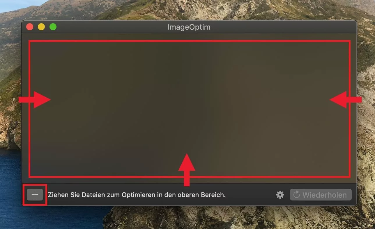 Für macOS ist die kostenlose App ImageOptin der einfachste Weg, um alle Bildinformationen zu löschen. Dazu einfach per Drag-and-Drop oder über das Plus-Symbol unten links die Bilder in die App laden: