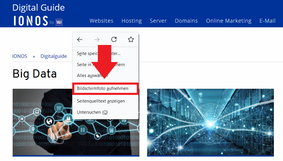 Schritt 1: Gehen Sie auf die Seite im Firefox-Browser, von der Sie eine Bildschirmaufnahme benötigen. Führen Sie dort einen Rechtsklick auf einen freien Seitenbereich aus. Es öffnet sich nun ein Kontextmenü, innerhalb dessen Sie „Bildschirmfoto aufnehmen“ auswählen.
