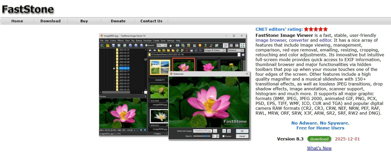 | Unterstützte Dateiarten | RAW-Varianten, PSD, MPO/JPS 3D-Bilder, WEBP | JPEG, TIFF, BMP, PNG, und einige RAWs | DNG, JPEG, TIFF, PNG, und die meisten RAWs | JPEG, PNG, GIF |
