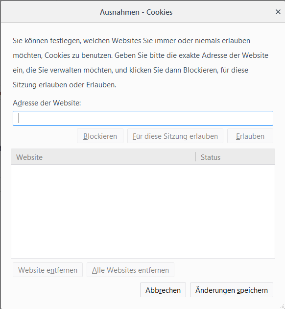 Entfernt man das Häkchen bei „Cookies von Websites akzeptieren“, blockiert man die Cookies von allen Webseiten. Über die Schaltfläche „Ausnahmen…“ lassen sich zudem Websites definieren, deren Cookies trotz Blockade zugelassen werden sollen. Zu diesem Zweck tragen Sie einfach die entsprechenden Domains ein und wählen „Erlauben“ oder auch „Für diese Sitzung erlauben“.