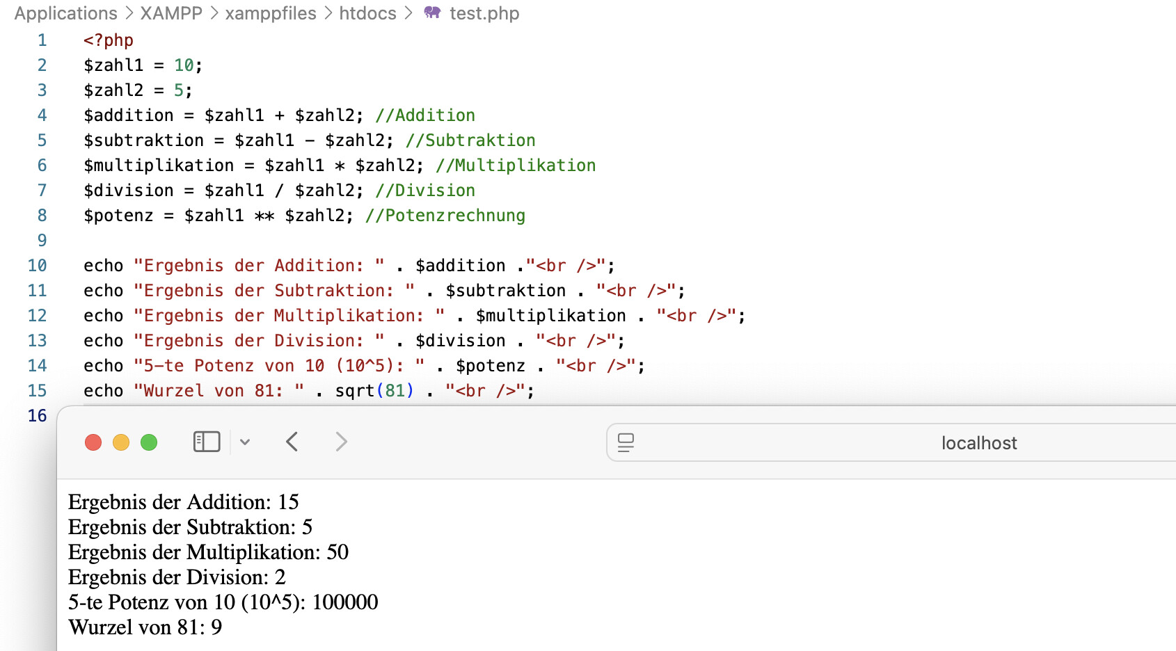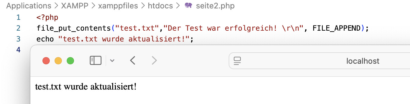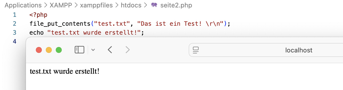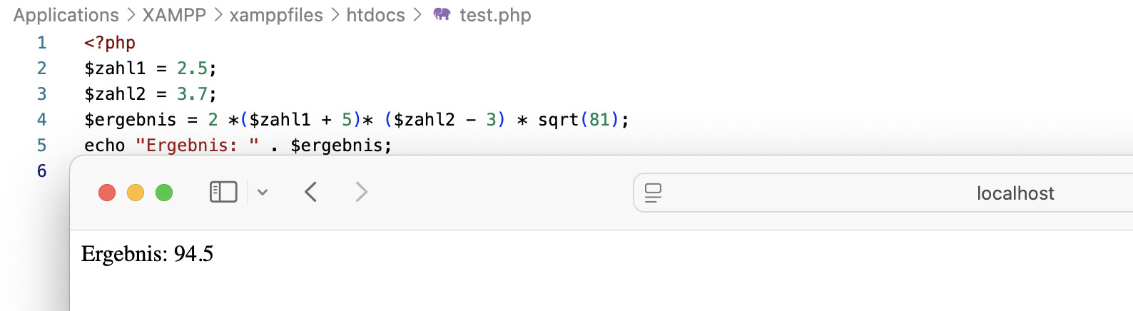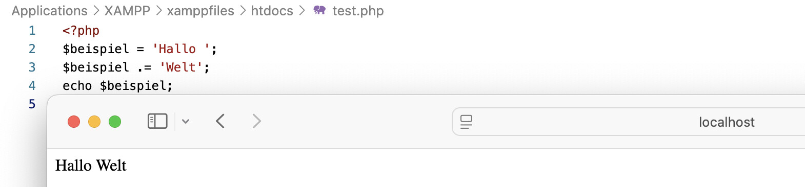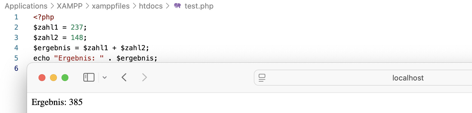 Die Beispieldatei lässt sich nun über folgende URL im Webbrowser aufrufen: http://localhost/test.php. Verwenden Sie einen anderen Webserver oder eine individuelle Konfiguration der XAMPP-Software, wählen Sie die URL dem jeweiligen Dateipfad entsprechend.