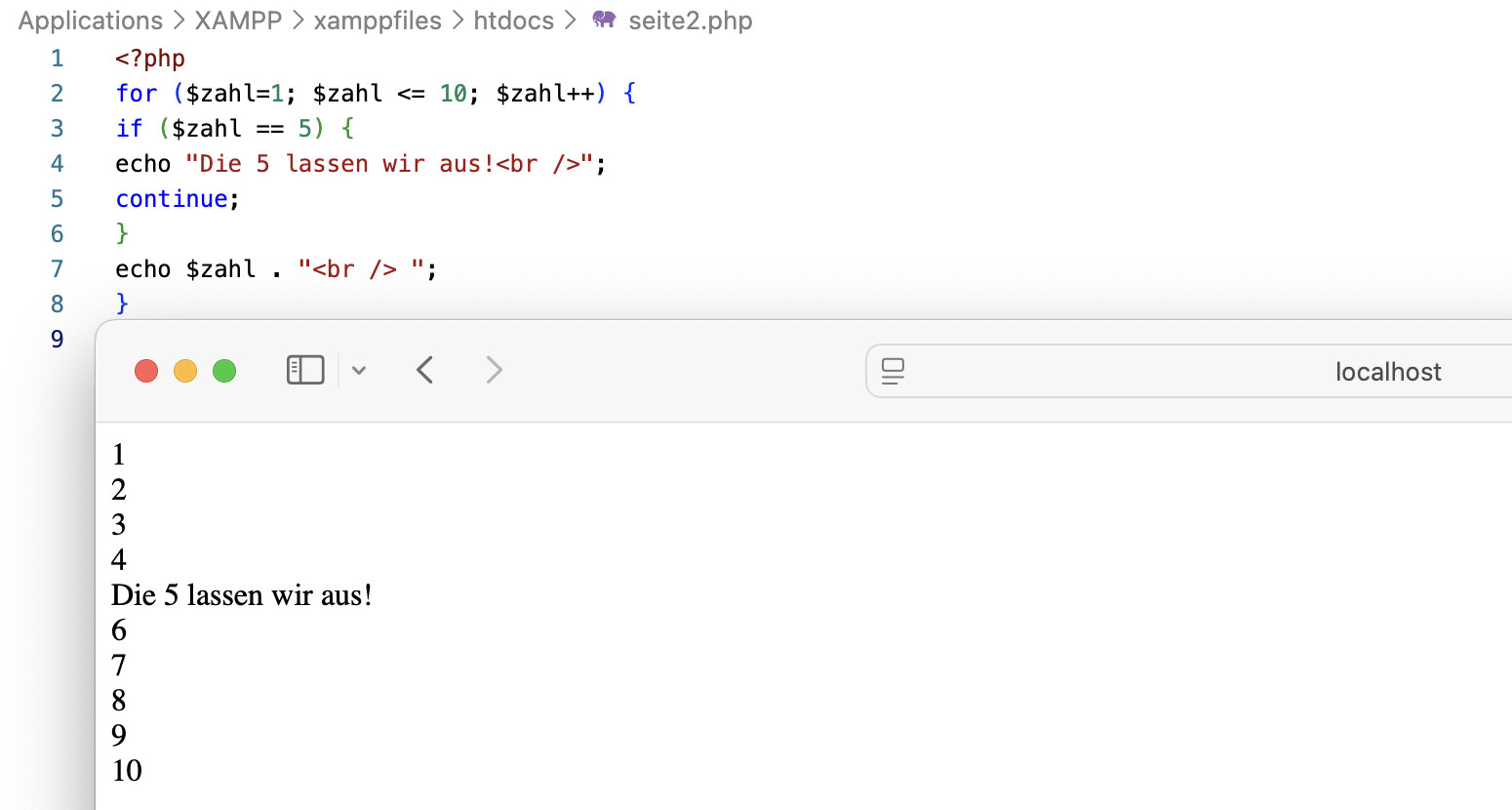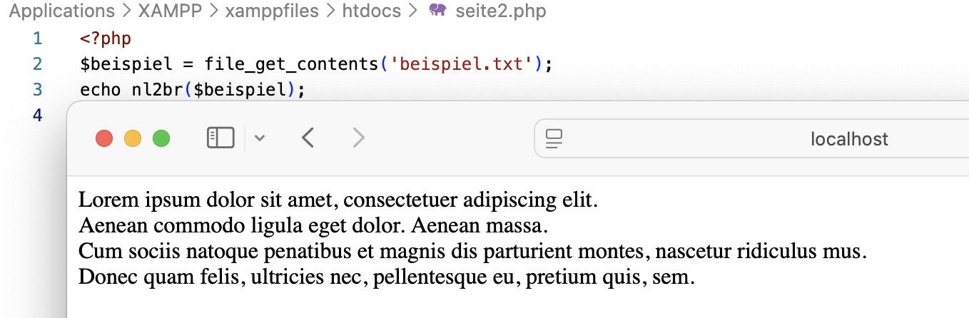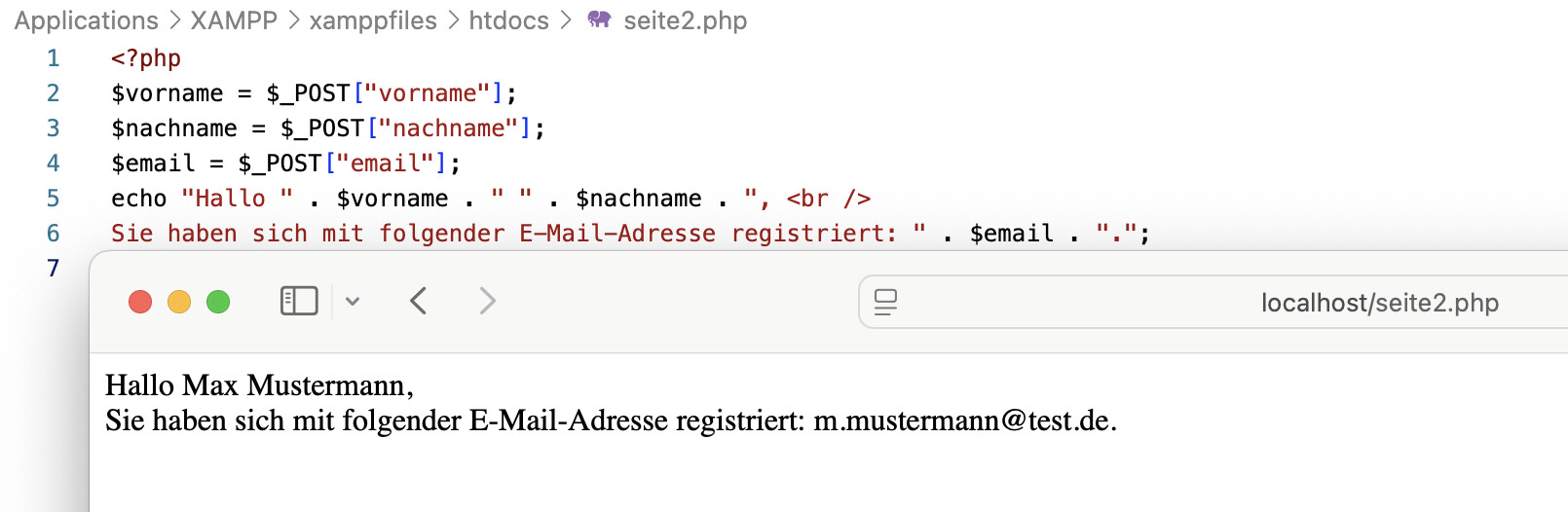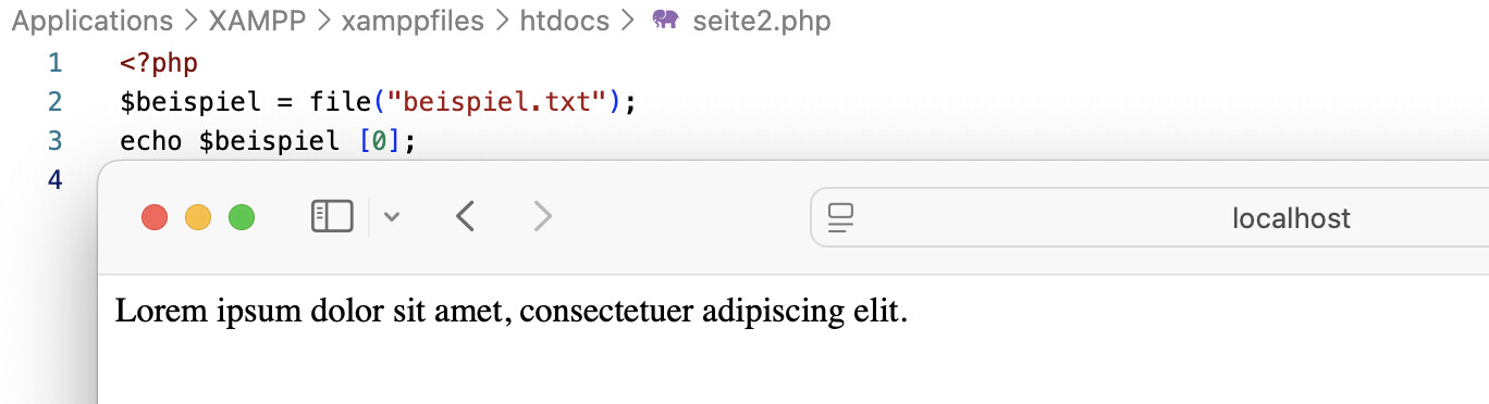 Die Beispieldatei lässt sich nun über folgende URL im Webbrowser aufrufen: http://localhost/test.php. Verwenden Sie einen anderen Webserver oder eine individuelle Konfiguration der XAMPP-Software, wählen Sie die URL dem jeweiligen Dateipfad entsprechend.