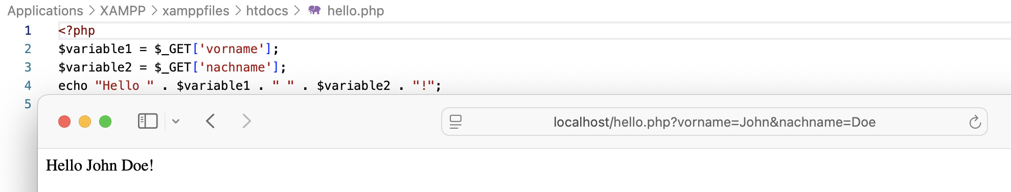 Mit dem Eintippen der URL http://localhost/test.php weisen Sie Ihren Webbrowser an, die Datei „test.php“ vom Webserver anzufordern. Der Apache HTTP Server oder die von Ihnen bevorzugte Webserver-Software ruft die Datei im entsprechenden Verzeichnis ab. Die Endung .php kündigt an, dass die Datei PHP-Code enthält. Nun schaltet sich der in den Webserver eingebundene PHP-Interpreter ein. Dieser parst das Dokument und stößt auf das öffnende PHP-Tag <?php. Der Interpreter ist in der Lage, den PHP-Code auszuführen und eine HTML-Ausgabe zu erzeugen, die vom Webserver an den Webbrowser ausgeliefert wird.