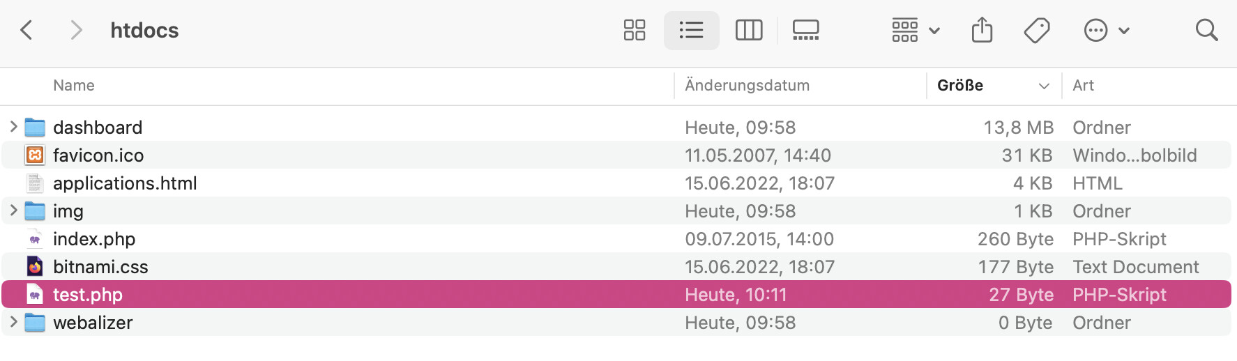 Speichern Sie die Textdatei unter dem Namen „test“ im Format .php (PHP-Skript) ab und starten Sie Ihren Webserver. Sofern Sie die Testumgebung XAMPP nutzen, legen Sie „test.php“ im XAMPP-Verzeichnis unter „htdocs“ ab (C:\xampp\htdocs).
