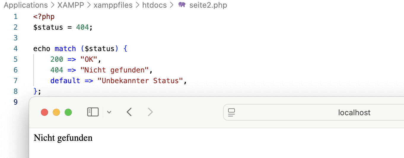 php -S localhost:8000bashPHP stellt die Dateien im aktuellen Ordner anschließend unter der Adresse http://localhost:8000 im Webbrowser bereit. Der Built-in Server eignet sich vor allem für erste PHP-Experimente, kleine Testskripte oder das schnelle Nachvollziehen von Codebeispielen.