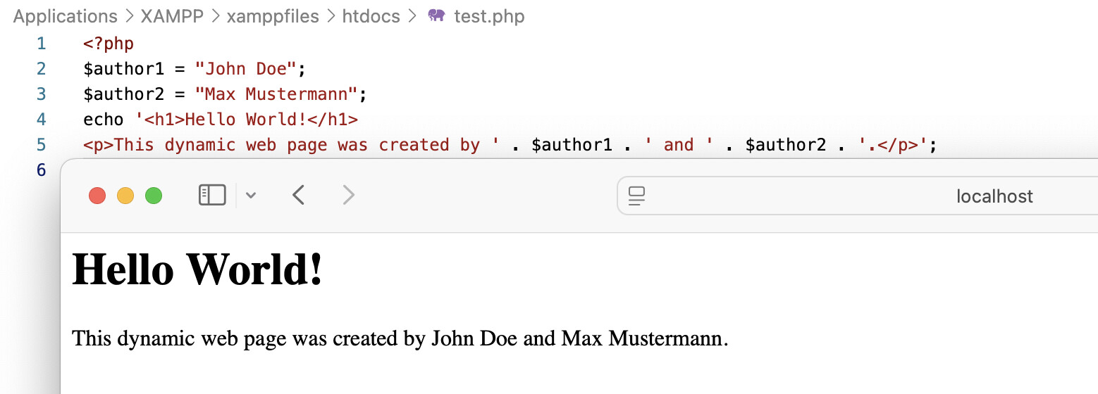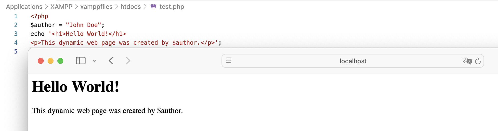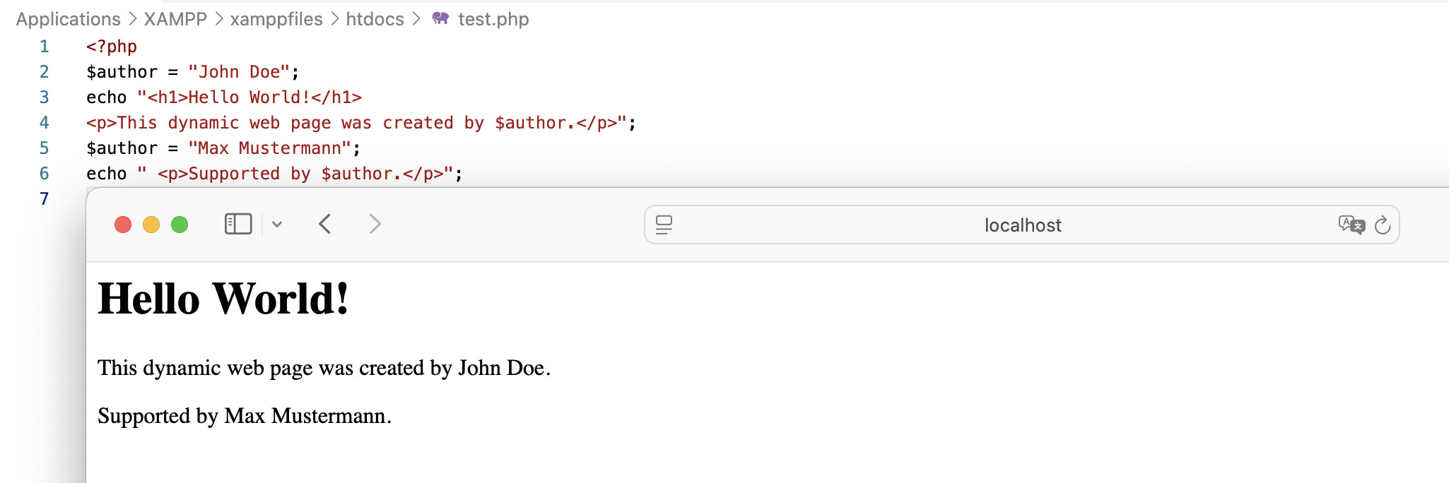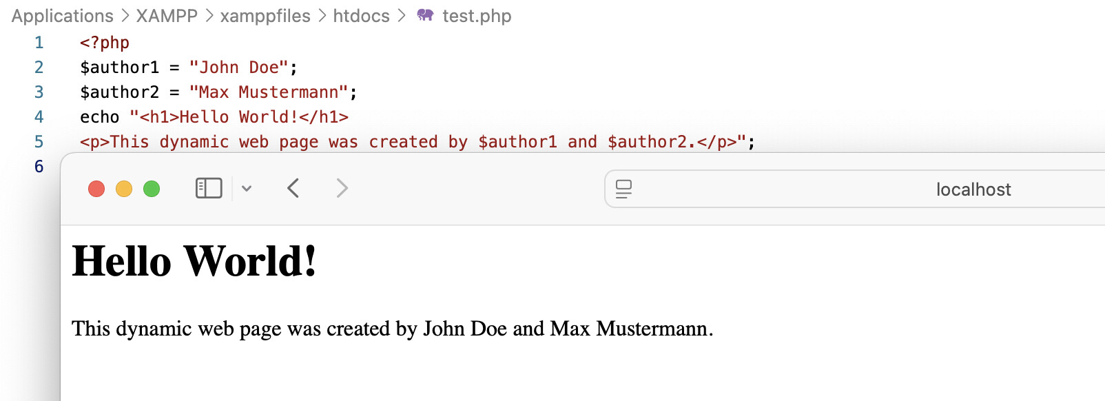 <p>This dynamic web page was created by $author.</p>";phpAuf das öffnende PHP-Tag folgt die Definition der Variable: Für $author soll der Wert „John Doe“ verwendet werden. Bei der Skriptausführung wird die Variable $author somit bei jeder Nennung innerhalb der Skript-Umgebung durch den Wert „John Doe“ ersetzt. Wie das im Webbrowser aussieht, zeigt die nachstehende Grafik.